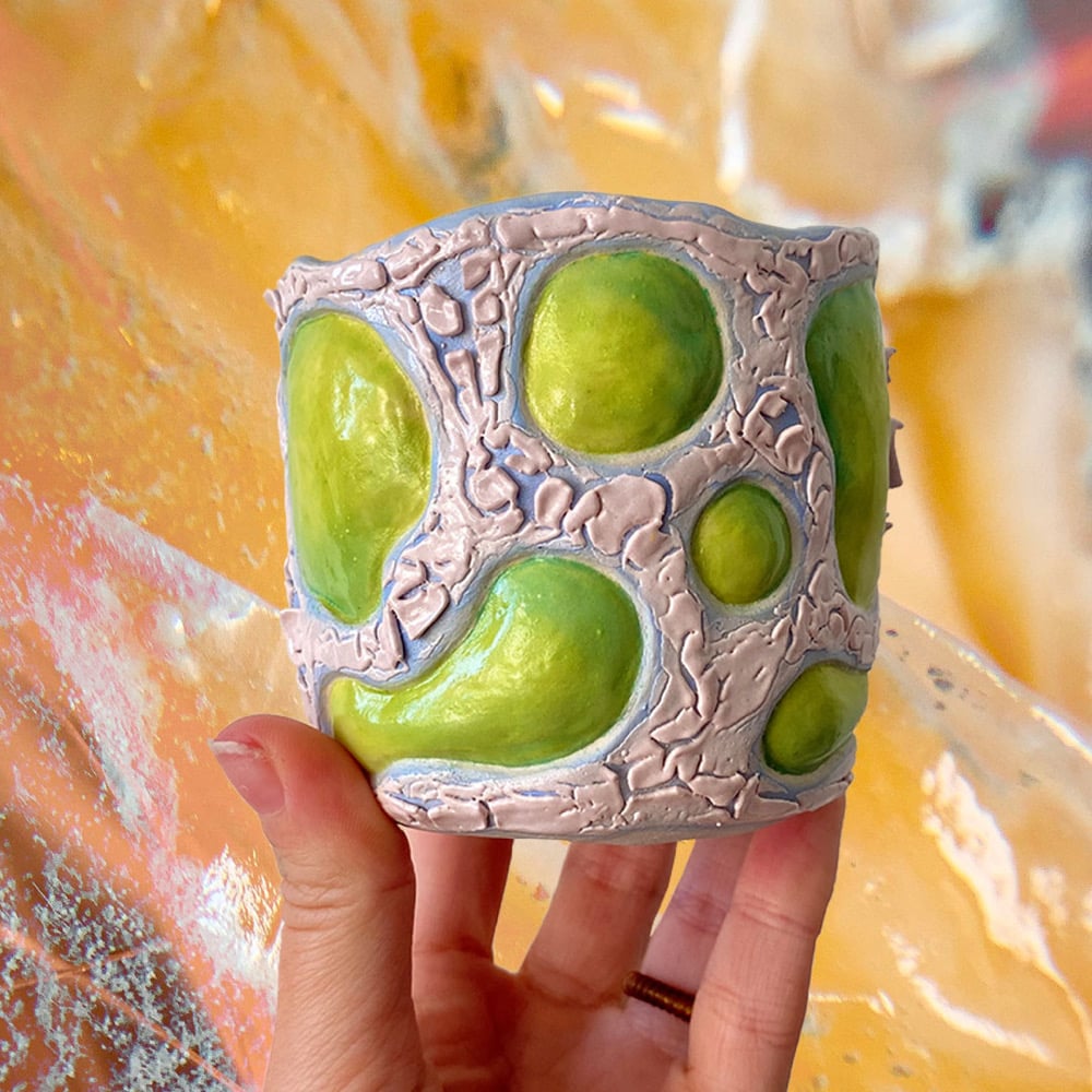This one-of-a-kind piece combines artistry and functionality, making it as fabulous to hold as it is to behold. A piece of functional art inspired by retro sci-fi films and stories. Featuring bold colours, metallic surfaces and otherworldly textures reminiscent of alien landscapes and celestial bodies.