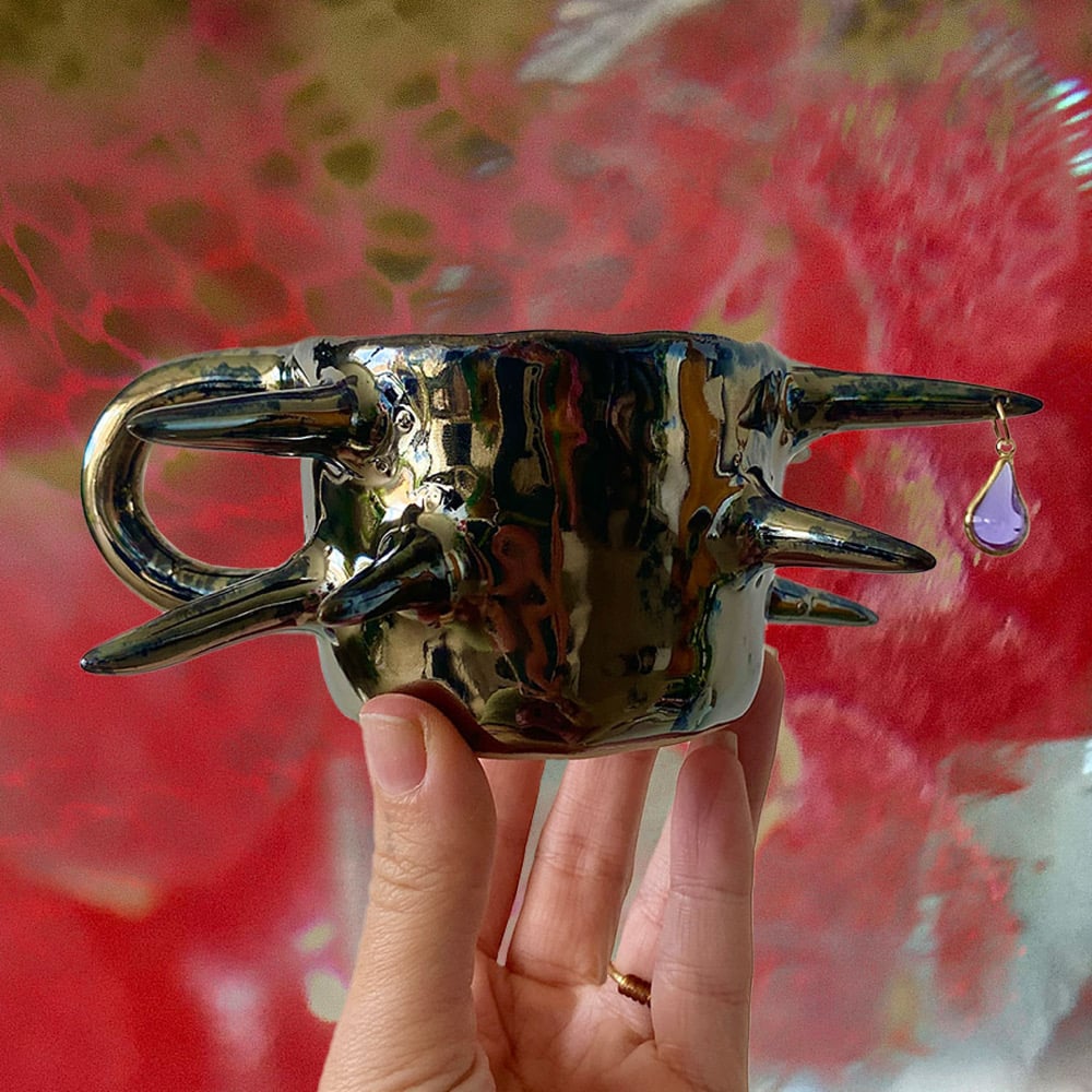 This one-of-a-kind piece combines artistry and functionality, making it as fabulous to hold as it is to behold. A piece of functional art inspired by retro sci-fi films and stories. Featuring bold colours, metallic surfaces and otherworldly textures reminiscent of alien landscapes and celestial bodies.